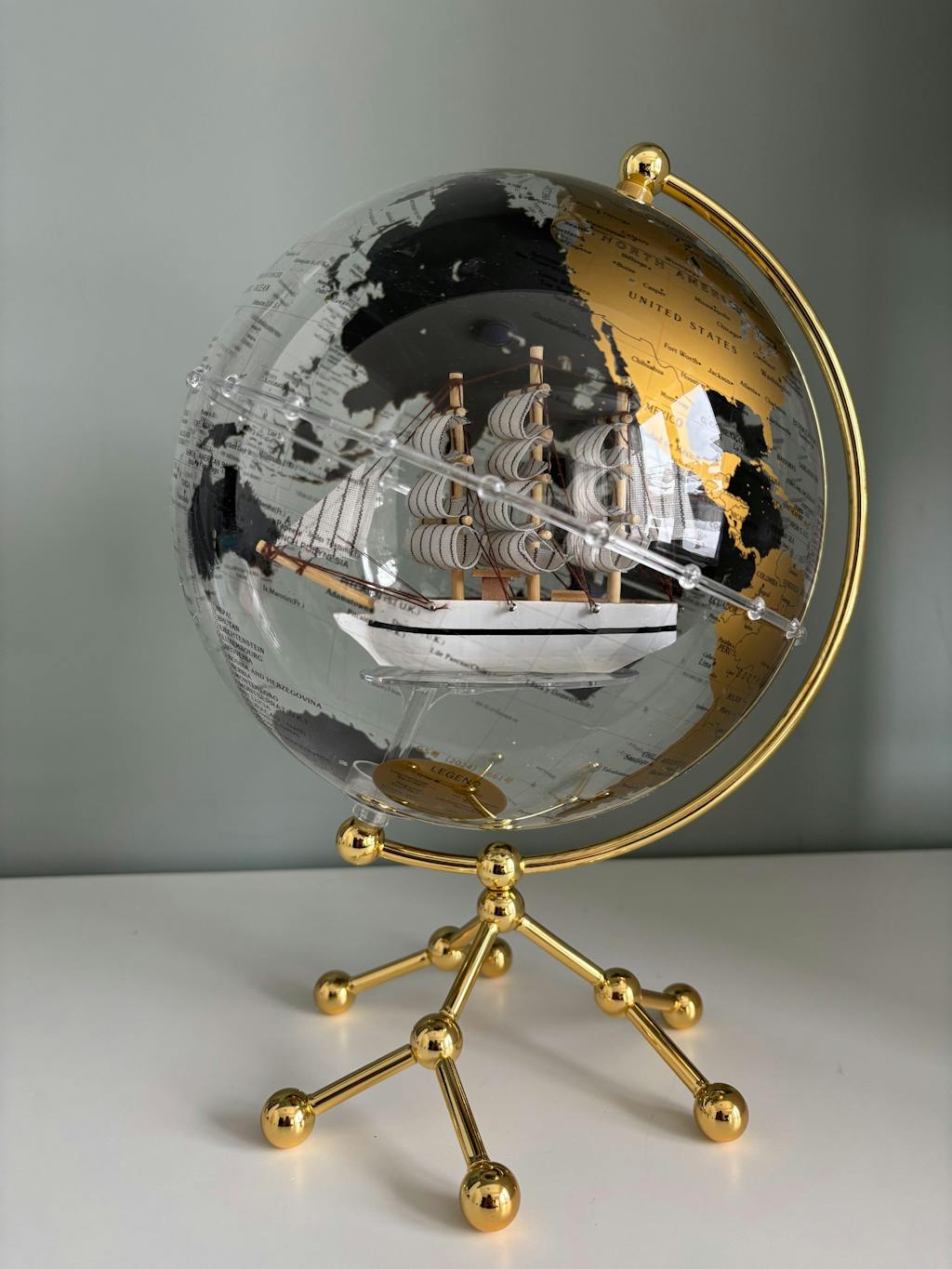 A golden world map encircles a crystal-clear globe, anchored by a sculpted sailing ship — a reminder that calm, beauty, and exploration belong in your everyday space.